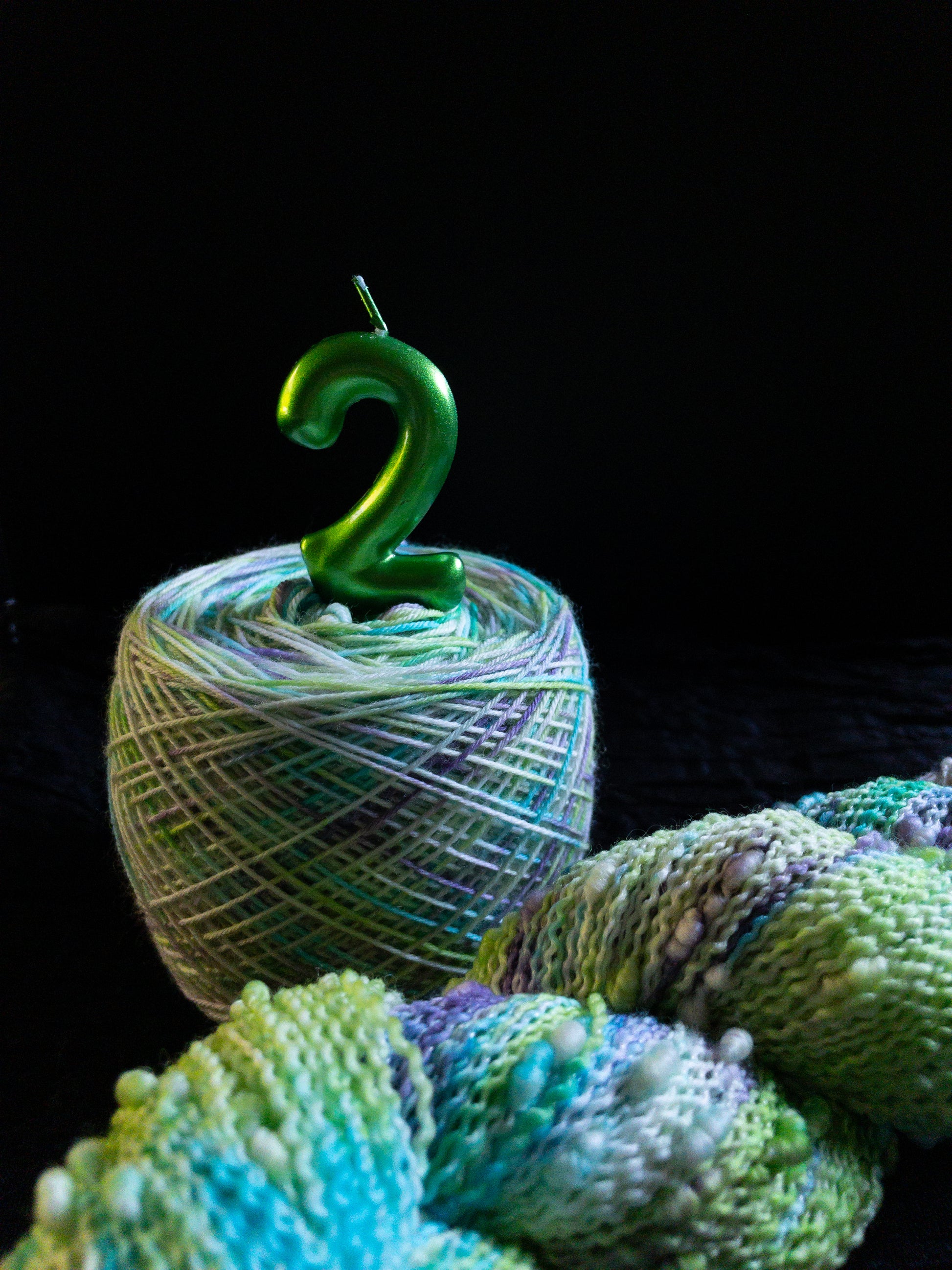 Painted Fern Fiber Co. is officially 2 years old! Thank you for being here and for celebrating with me. Fernfetti is available on the Shield Sock and Painted DK bases, plus a special Celebration Slub (fingering weight) base that I felt fit the color and the occasion!