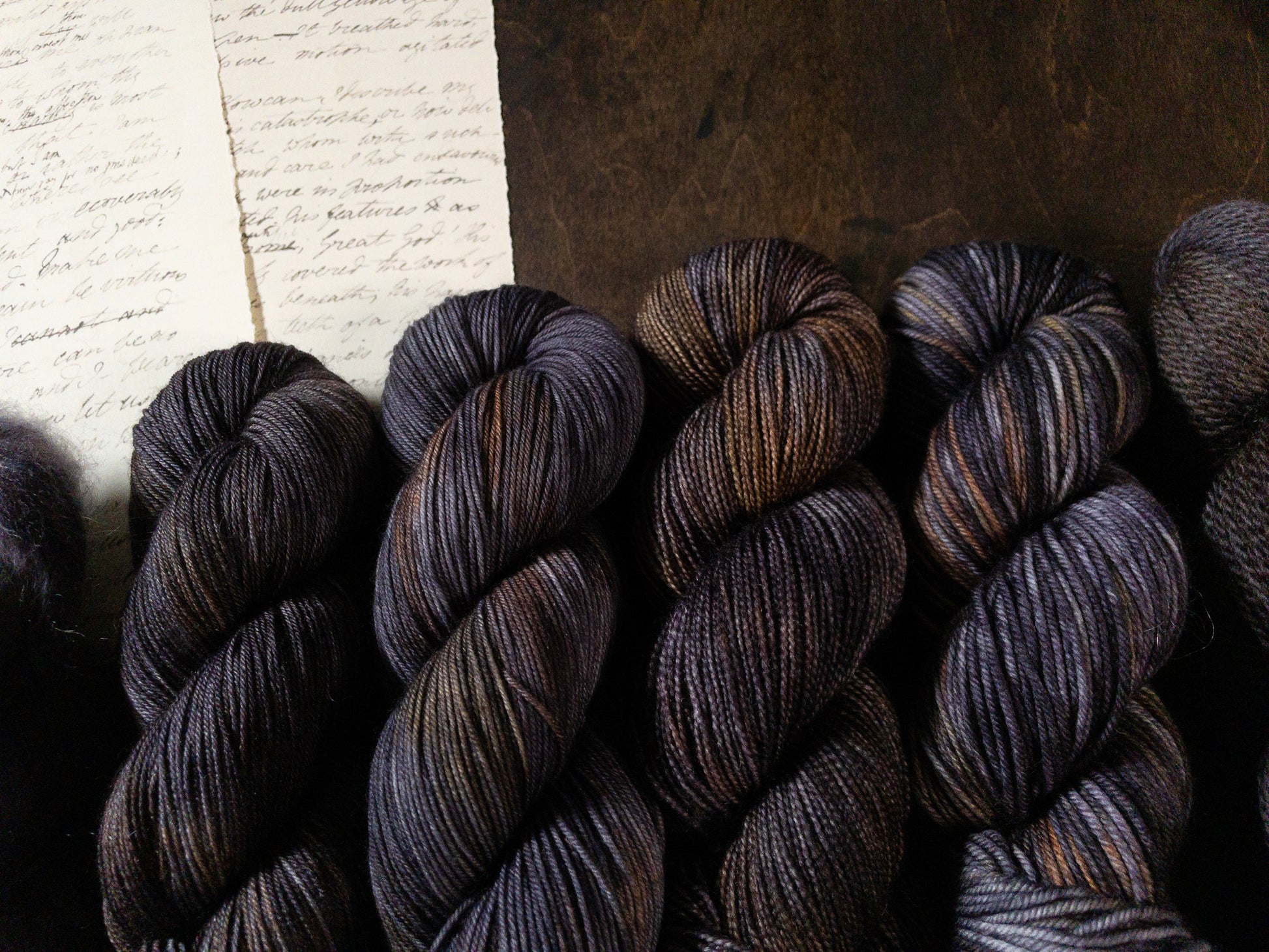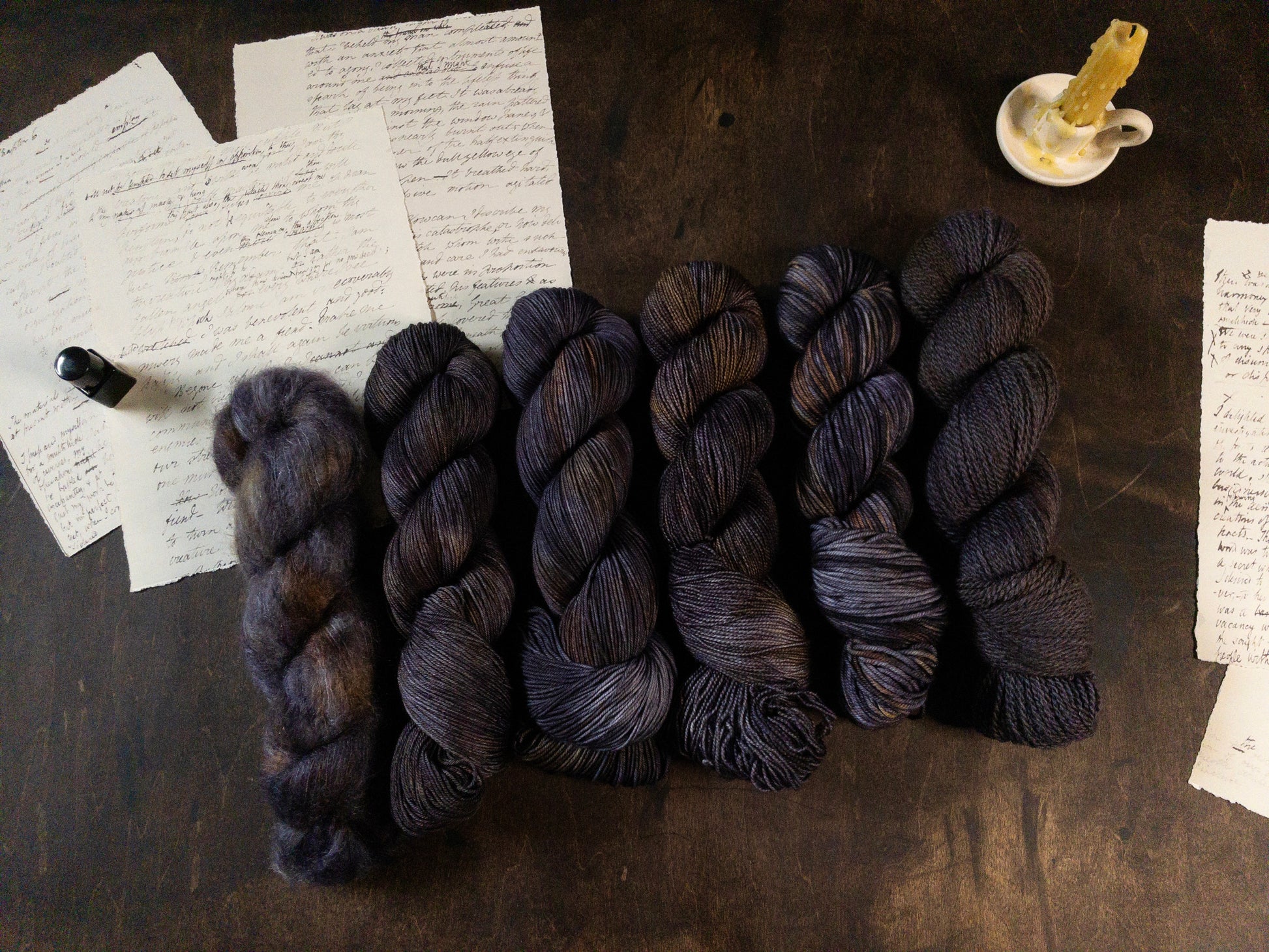 Bases pictured from left to right: silver lace mohair, ribbon fingering, shield sock, bird's nest sock, painted DK, bracken DK