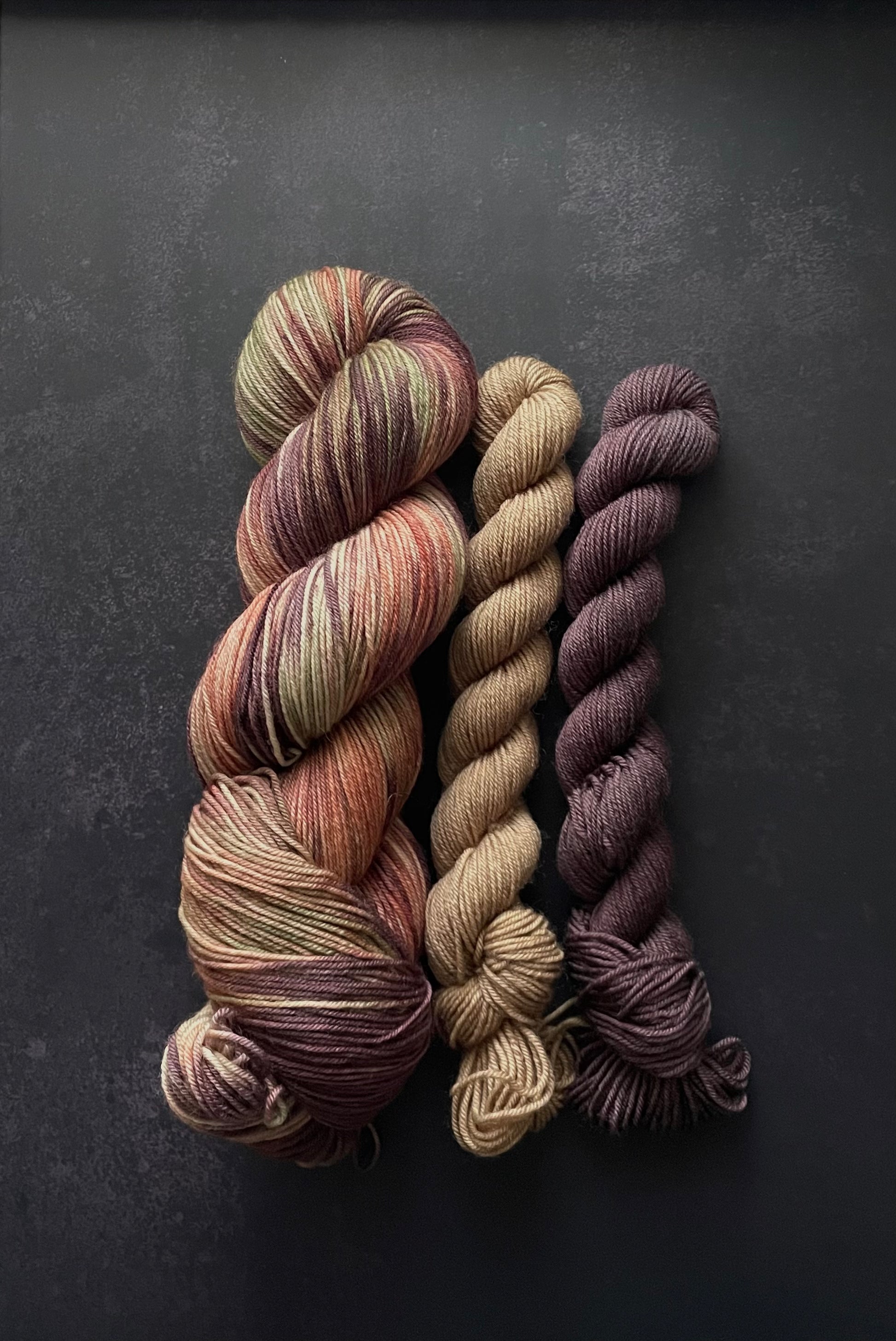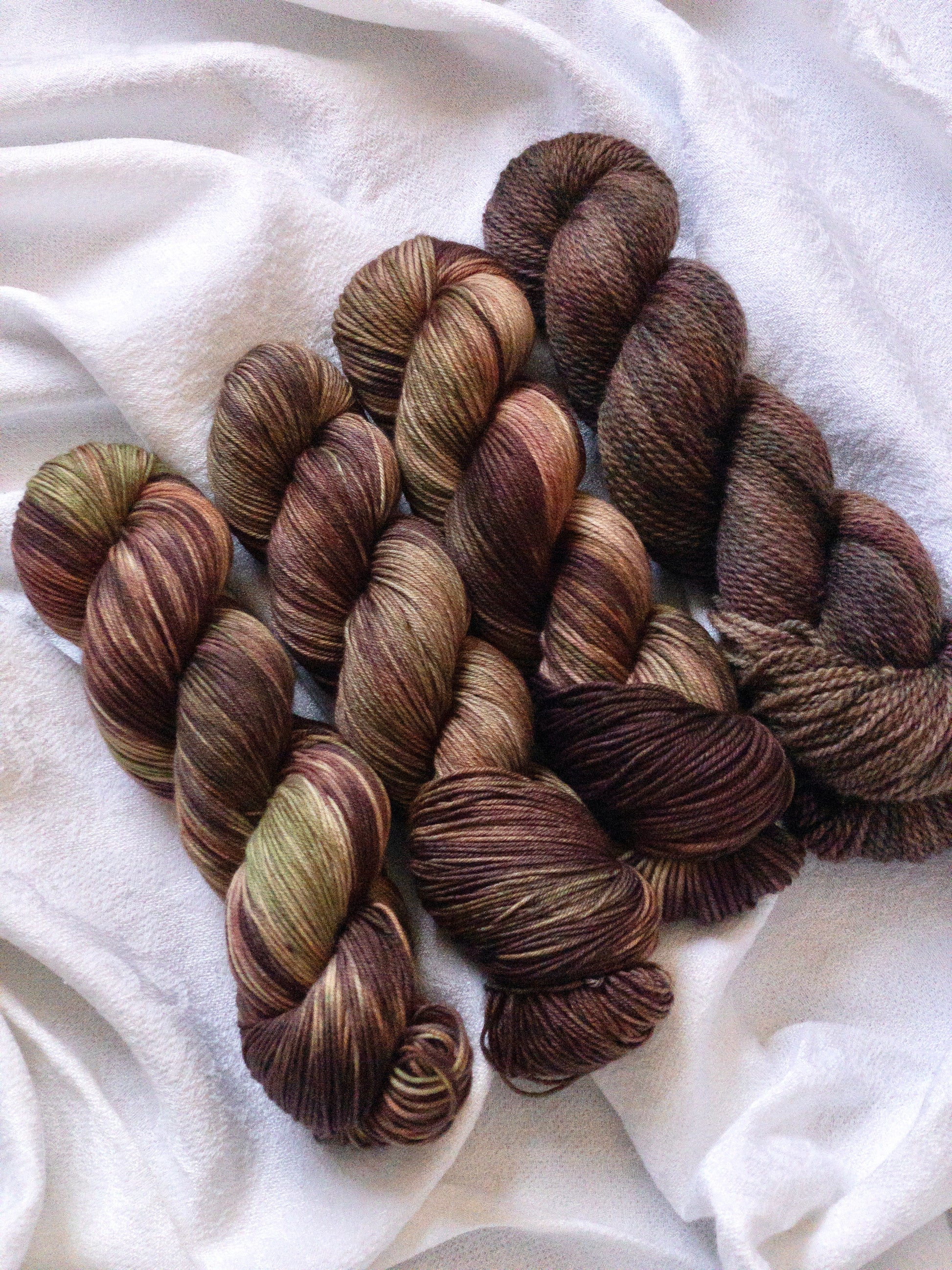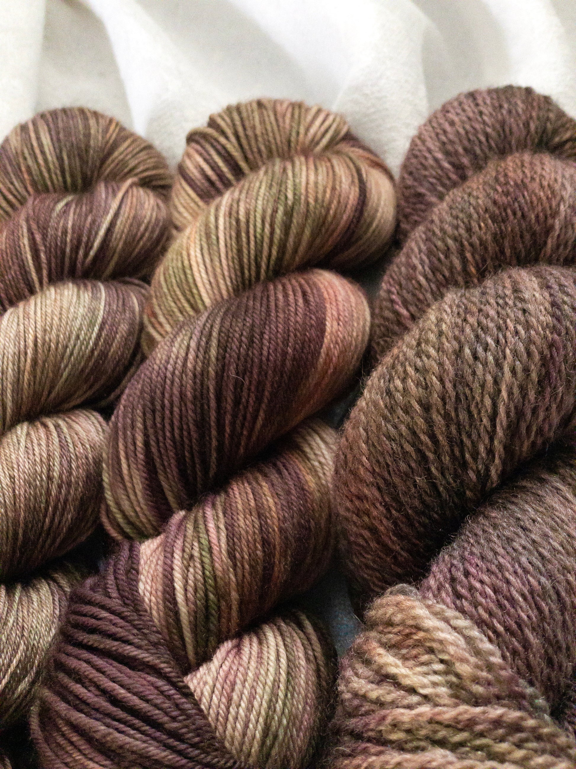 Bases pictured from left to right: shield sock, ribbon fingering, painted DK, bracken DK