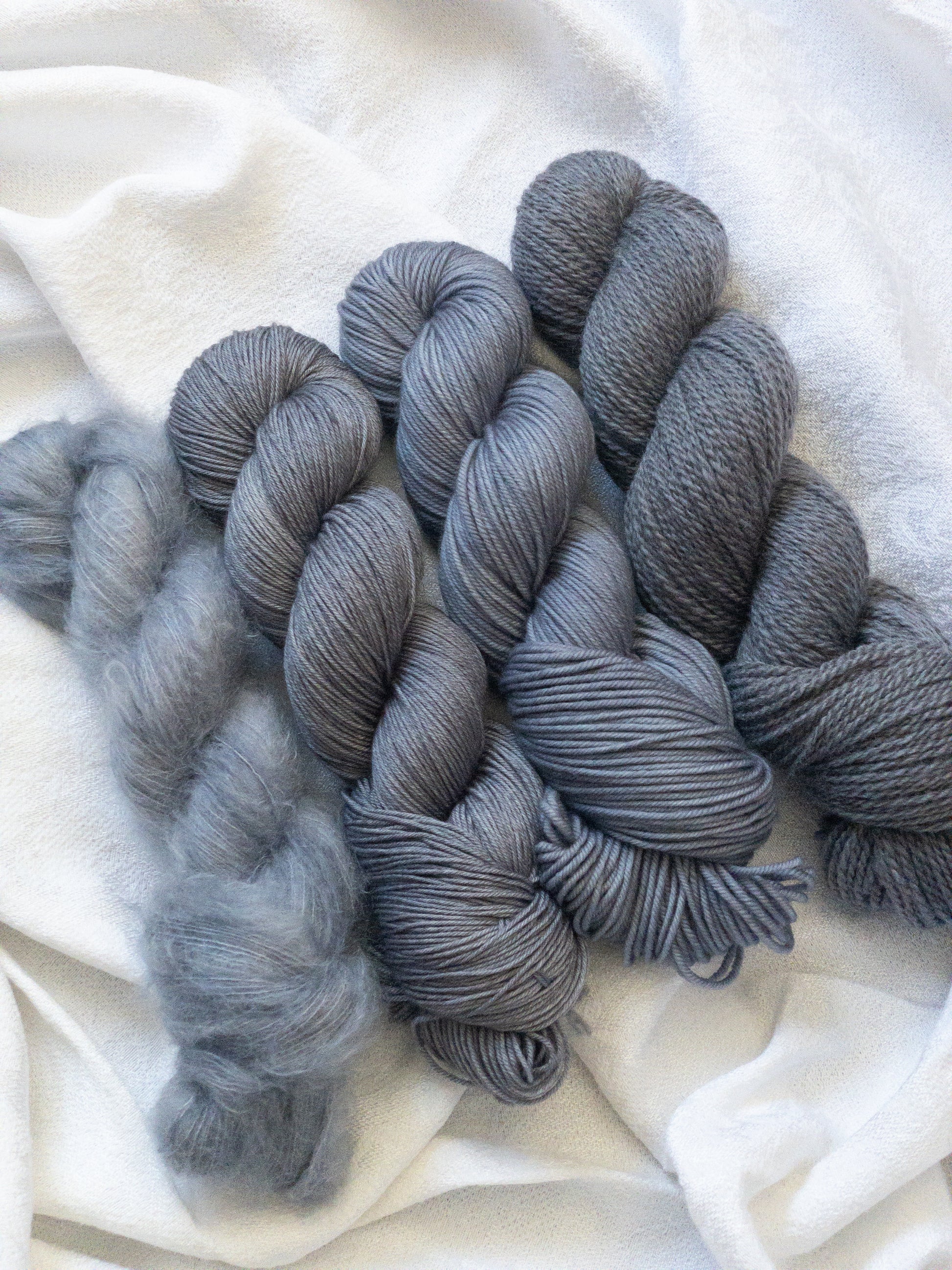 Bases pictured from left to right: silver lace mohair, ribbon fingering, painted DK, bracken DK