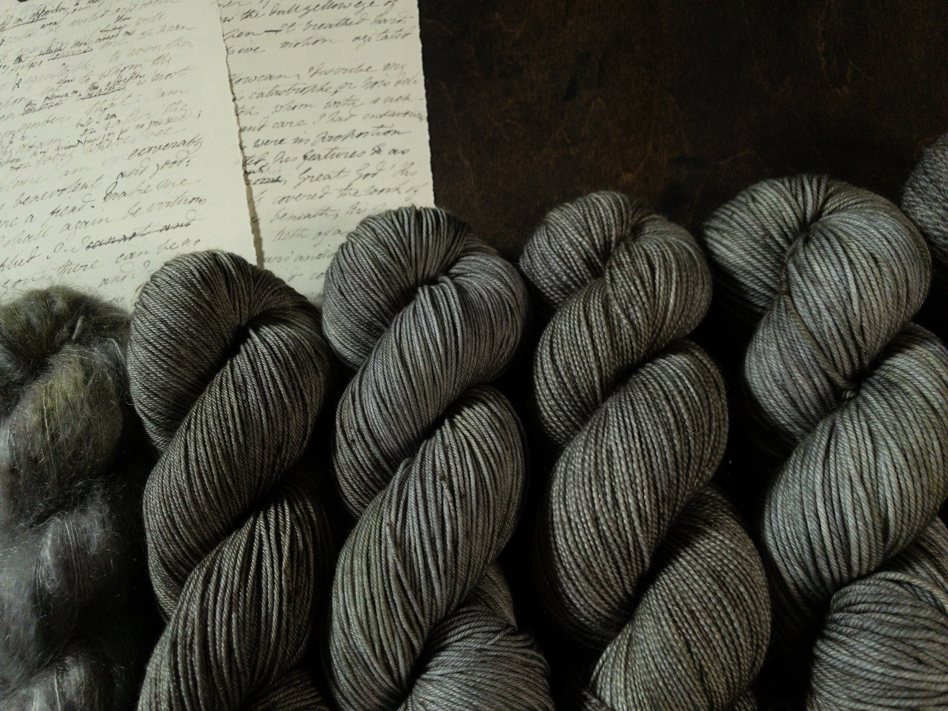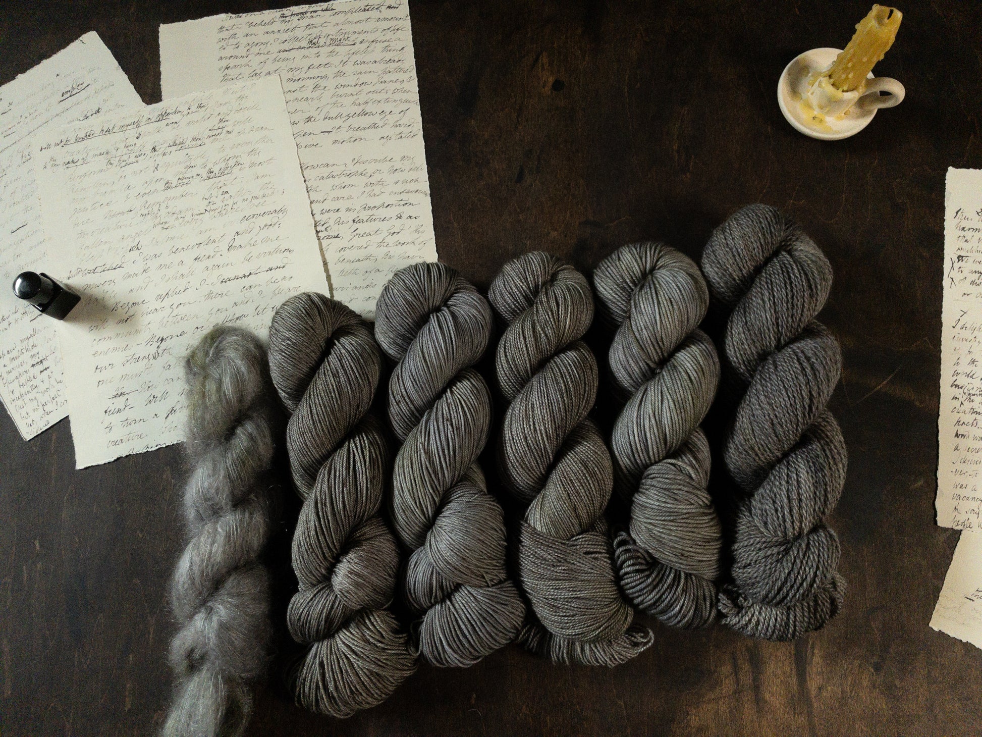 Bases pictured from left to right: silver lace mohair, ribbon fingering, shield sock, bird's nest sock, painted DK, bracken DK