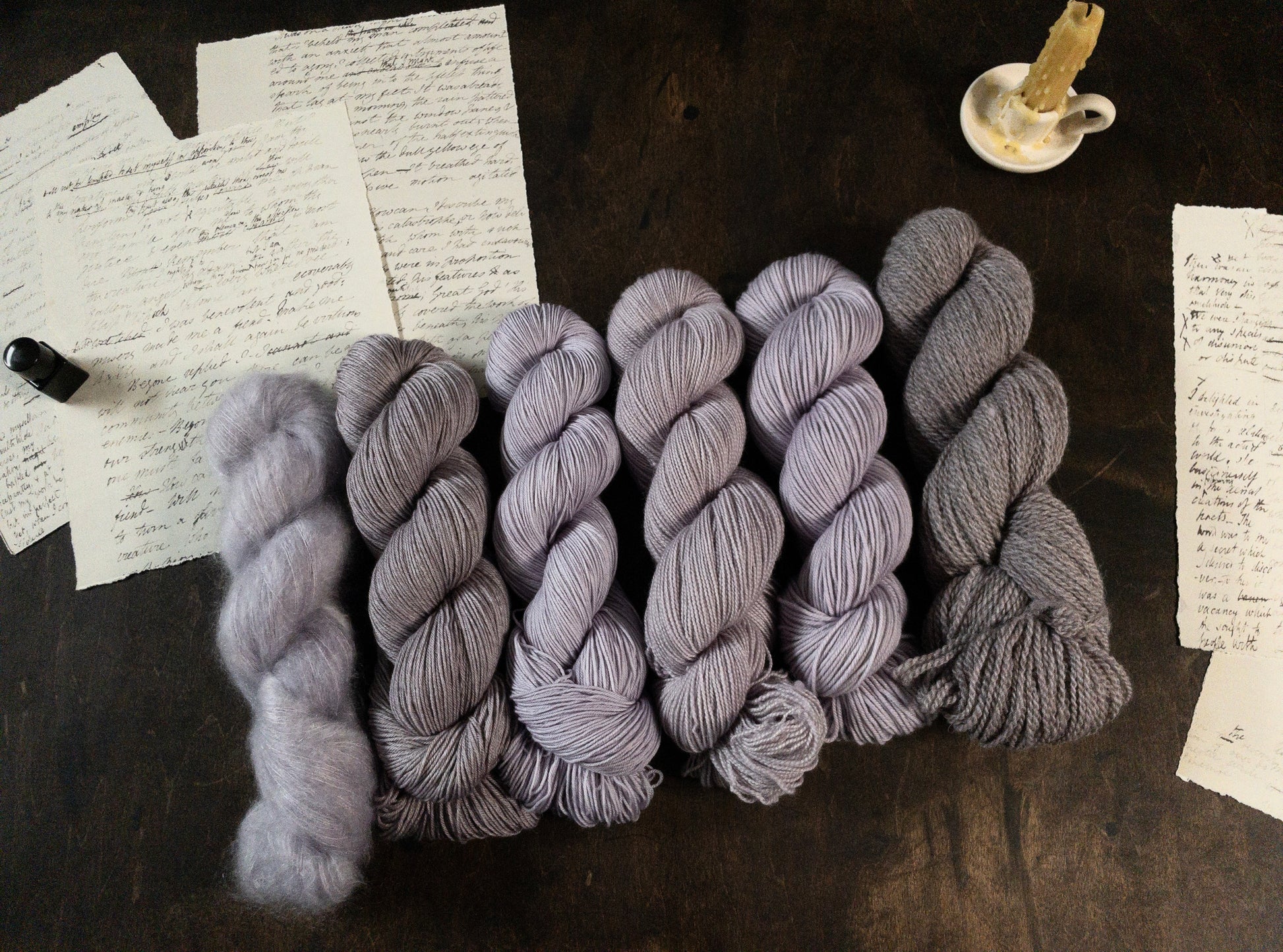 Bases pictured from left to right: silver lace mohair, ribbon fingering, fiddlehead fingering, bird's nest sock, painted DK, bracken DK