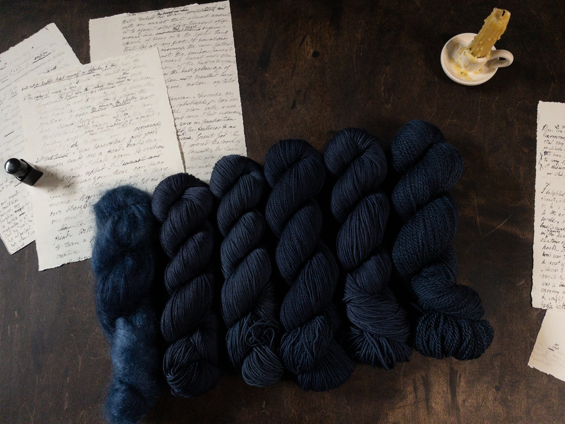 Bases pictured from left to right: silver lace mohair, ribbon fingering, fiddlehead fingering, bird's nest sock, painted DK, bracken DK