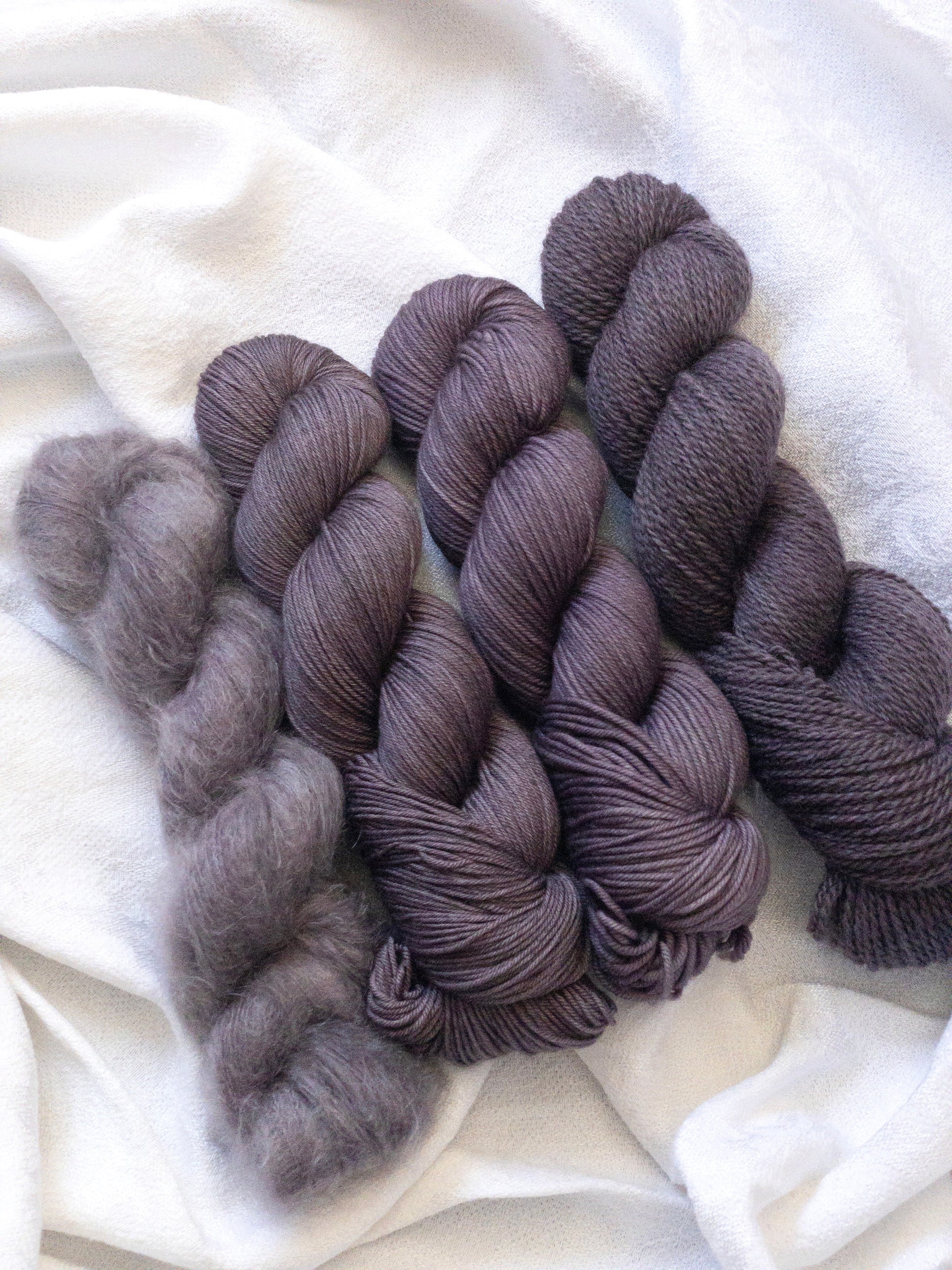 Bases pictured from left to right: silver lace mohair, ribbon fingering, painted DK, bracken DK